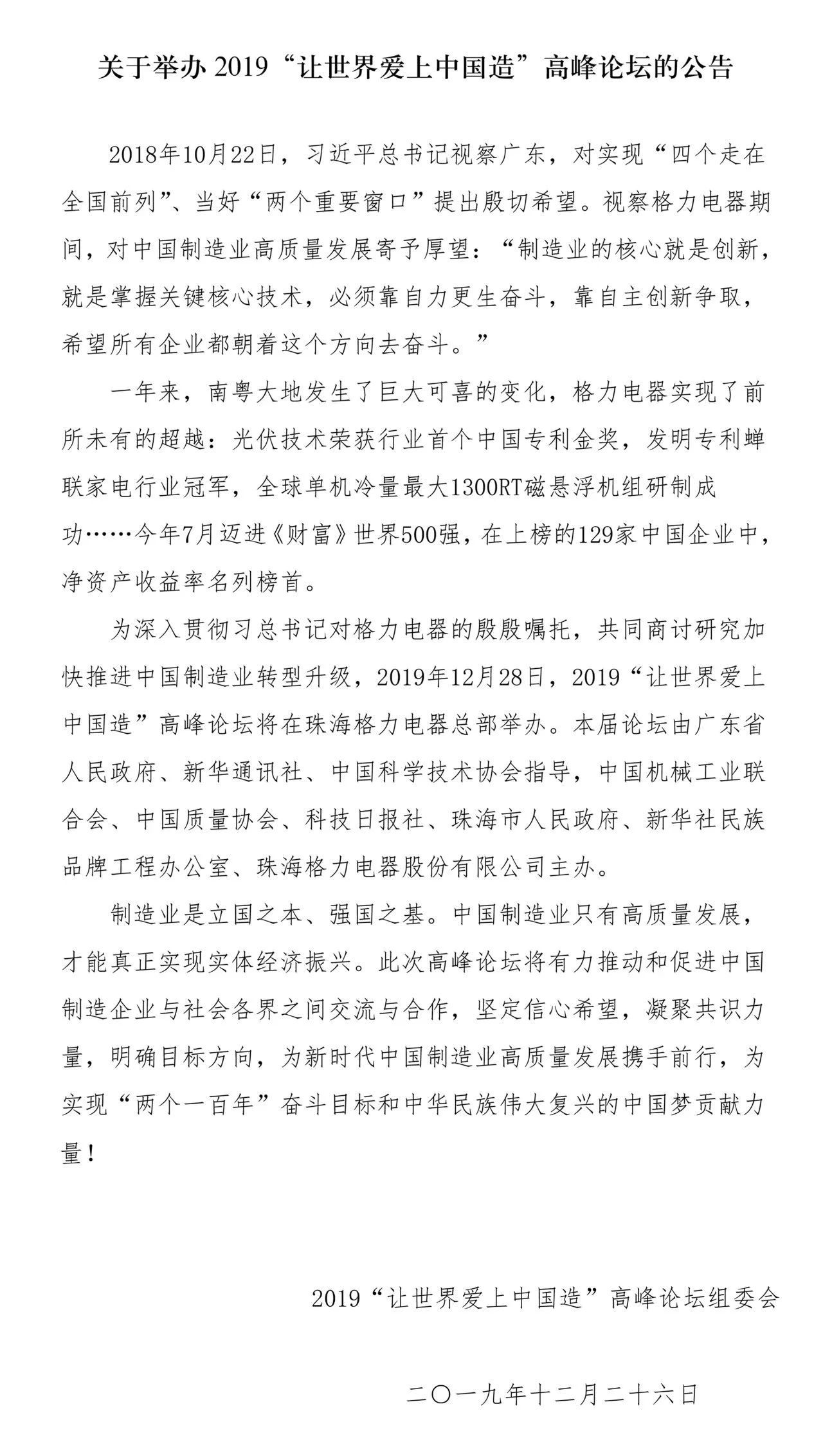 2018年10月22日,习近平总书记视察广东,对实现“四个走在全国前列”、当好“两个重要窗口”提出殷切希望。视察格力电器期间,对中国制造业高质量发展寄予厚望:“制造业的核心就是创新,就是掌握关键核心技术,必须靠自力更生奋斗,靠自主创新争取,希望所有企业都朝着这个方向去奋斗。” 一年来,南粤大地发生了巨大可喜的变化,格力电器实现了前所未有的超越:光伏技术荣获行业***个中国专利金奖,发明专利蝉联家电行业***军,全球单机冷量***大1300RT磁悬浮机组研制成功……今年7月迈进《财富》世界500强,在上榜的129家中国企业中,净资产收益率名列榜***。 为深入贯彻习总书记对格力电器的殷殷嘱托,共同商讨研究加快推进中国制造业转型升***,2019年12月28日,2019“让世界爱上中国造”高峰论坛将在珠海格力电器总部举办。本届论坛由广东省人民政府、新华通讯社、中国科学技术协会指导,中国机械工业联合会、中国质量协会、科技日报社、珠海市人民政府、新华社民族***工程办公室、珠海格力电器股份有限公司主办。 制造业是立国之本、强国之基。中国制造业只有高质量发展,才能真正实现实体经济振兴。此次高峰论坛将有力推动和促进中国制造企业与社会各界之间交流与合作,坚定信心希望,凝聚共识力量,明确目标方向,为新时代中国制造业高质量发展携手前行,为实现“两个一百年”奋斗目标和中华民族伟大复兴的中国梦贡献力量! 2019“让世界爱上中国造”高峰论坛组委会 二〇一九年十二月二十六日 |